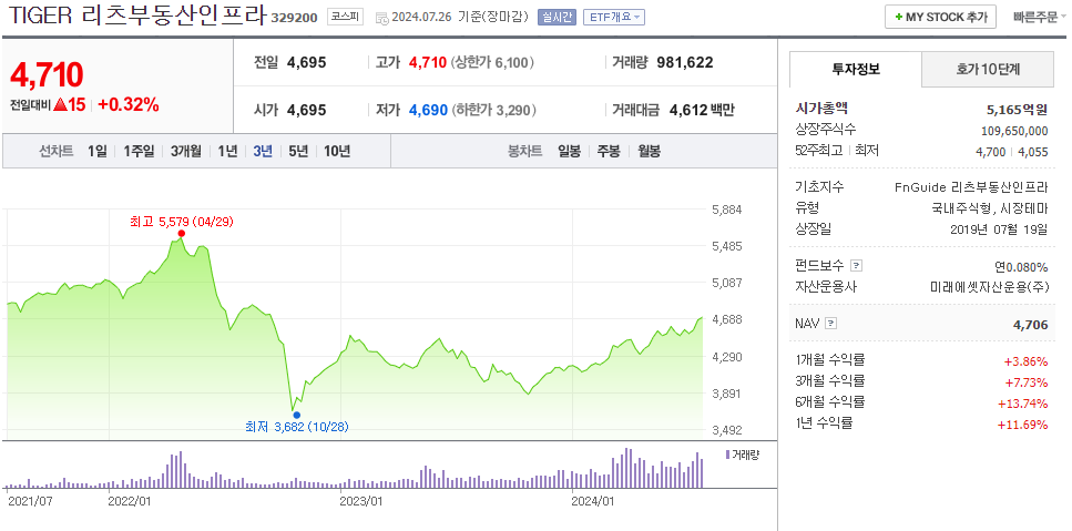 2019년에 상장한 TIGER 리츠부동산인프라의 주가는 24.07.26기준 4,710원입니다. 22년 4월 29일에 최고점인 5,579원까지 올라갔다가 22년 10월 28일에 3,682원까지 빠졌네요. 현재 24년 7월 기준으로는 전년대비 11.69% 상승되었네요. 확실히 금리인하에 대한 기대감이 선반영된 결과입니다.