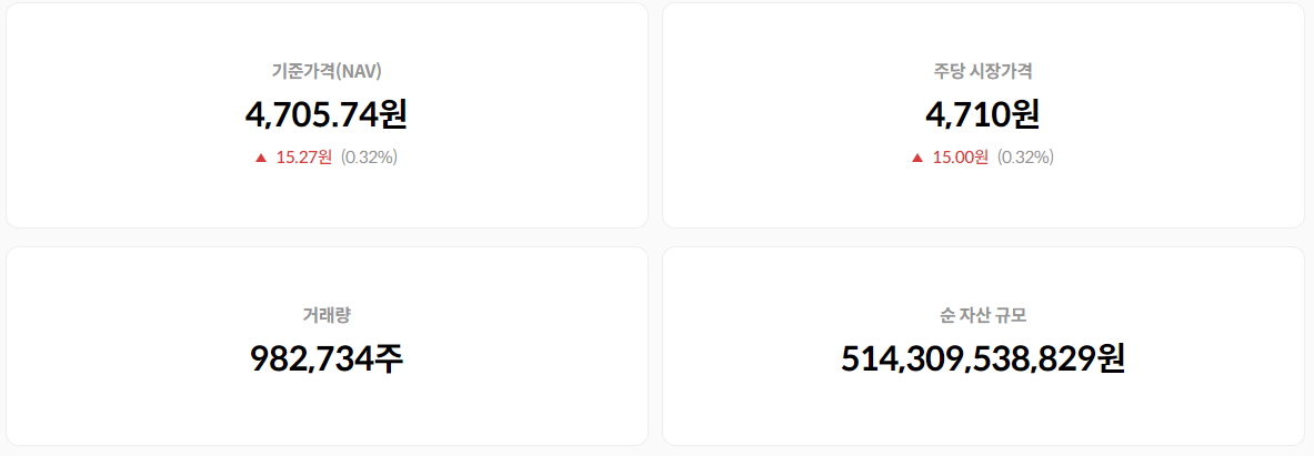 현재 주당 시장가격은 4,710원이고 거래량은 982,734주, 순 자산규모는 5,143억입니다.