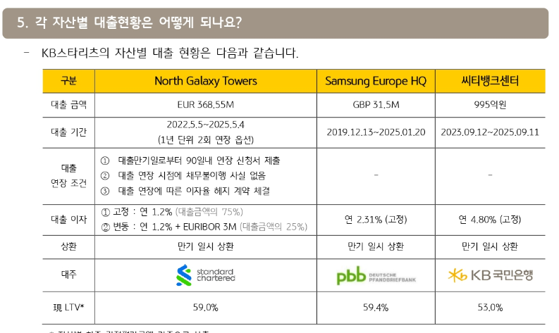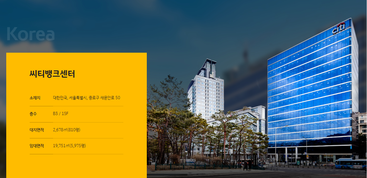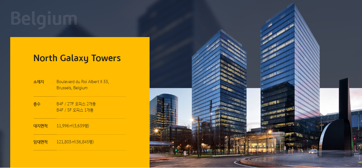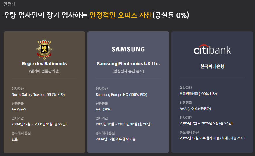 대표 임차인을 살펴보면, 벨기에 건물관리청이 99.7%임차, 삼성전자 유럽본사가 100%임차, 한국씨티은행이 100%임차를 하고 있습니다. 그리고 임차기간도 29~39년으로 매우 길게 잡혀있네요. 중도해지옵션도 없거나 25년 12월 이후로 잡혀있으니 안정성은 뛰어난 편이라 투자 매력도가 높은 편입니다.