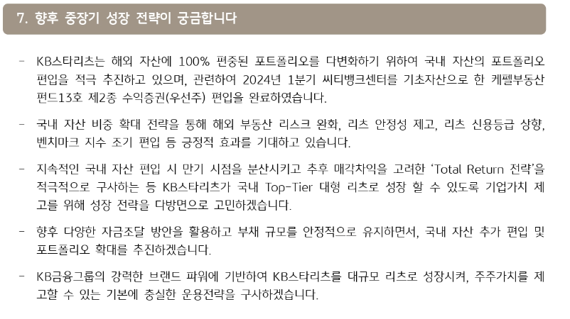 향후 중장기 성장전략은 아래와 같이 부채규모를 안정적으로 유지하면서, 국내 자산 추가 편입 및 포트폴리오 확대를 추진하겠다고 하네요.