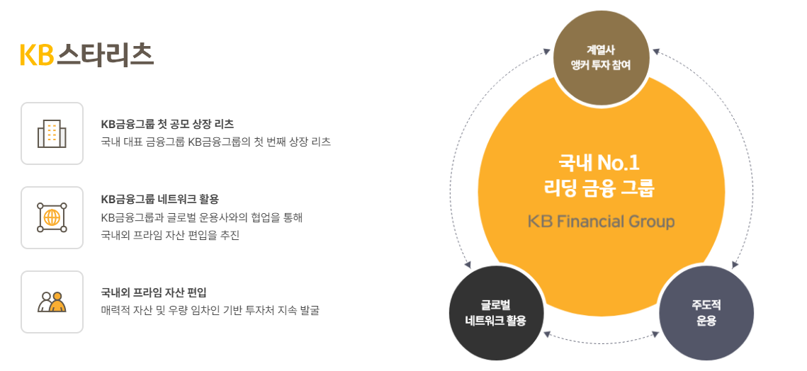 KB금융그룹에서 첫 공모상장 리츠이며, 상장은 2022년 10월 06일에 하였습니다. 결산주기는 매년 1월말, 7월말로 6개월단위입니다. 특징은 국내외 자산 운용사와 협업을 통해 국내외 모두 투자를 하고 있다는 것이고, 우량한 임차인을 보유하고 있다는 것입니다.