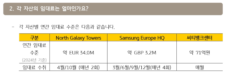임대료는 아래의 표와 같습니다. 이자비용대비 임대료율은 North Galaxy Tower는 7.68배, Samsung Europe HQ는 4.4배, 씨티뱅크센터는 1.48배 정도 되네요.