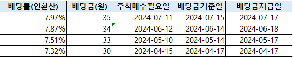 배당율은 배당금지급일 기준주가로 연환산했을때 평균 7.5%의 배당율이 나옵니다. 꽤 매력적인 배당율 입니다. 예금이자나 증권사 발행어음도 5%채 안미치죠. 앞으로 금리가 인하되면 해당 배당율은 좀 더 매력도가 높아지겠죠.